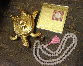 Business Success Alater- Vyapar Vridhi yantra , Rudraksha Sphatik Carnelian Crystal Quartz Mala, Sacred Geometry, Meru YAntra on Tortoise