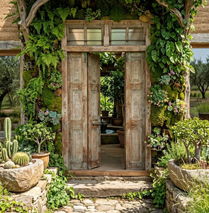 Classic Mediterranean Grandeur of Vintage double doors create a statement with their weathered, elegant appeal. These doors often feature ornate metalwork or intricate wooden carvings that add an old-world charm, characteristic of Mediterranean homes.Perfect for main entrances, courtyards, or interior spaces, these doors evoke a sense of history and welcome. Their distressed look brings warmth and authenticity, adding depth to any room.